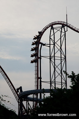Dodonpa is is a pretty simple roller-coaster, but that doesn’t stop it from being a pretty wild ride. What makes it wild is that it’s all about accelerating ’til blood comes out of your ears and going fast, Dodonpa goes from 0 to 107 mph (172 km/h) in less then 2 seconds. During take-off I thought my eyeballs were going to get squeezed out the back of my head. After the launch it goes down a long straight, around a huge banked turn then up a hill that goes straight up then down the hill going straight down and that’s pretty much it.