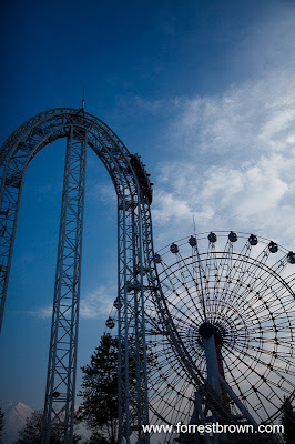 I when to the Fuji-Q Highland amusement park in Fujiyoshida Japan near the base of Mount Fuji with three Japanese friends, Ayako, Taka, and Kumiko. Taka and I took the bus from Shinjuku while Ayako and Kumiko meet us at Fuji-Q. Becasue the Shinjuku station is such a huge crazy maze of buildings and train platforms Taka and I couldn’t find each other and ended up missing the bus we had planned to take. Fortunately there was another bus, but we had to wait an hour.
