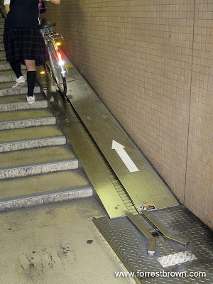 Kachidoki Station has an large underground bicycle parking area and in the stairs going out of the parking area is this cool bicycle conveyor belt. Just roll your bicycle onto the conveyor belt as you walk along side it.